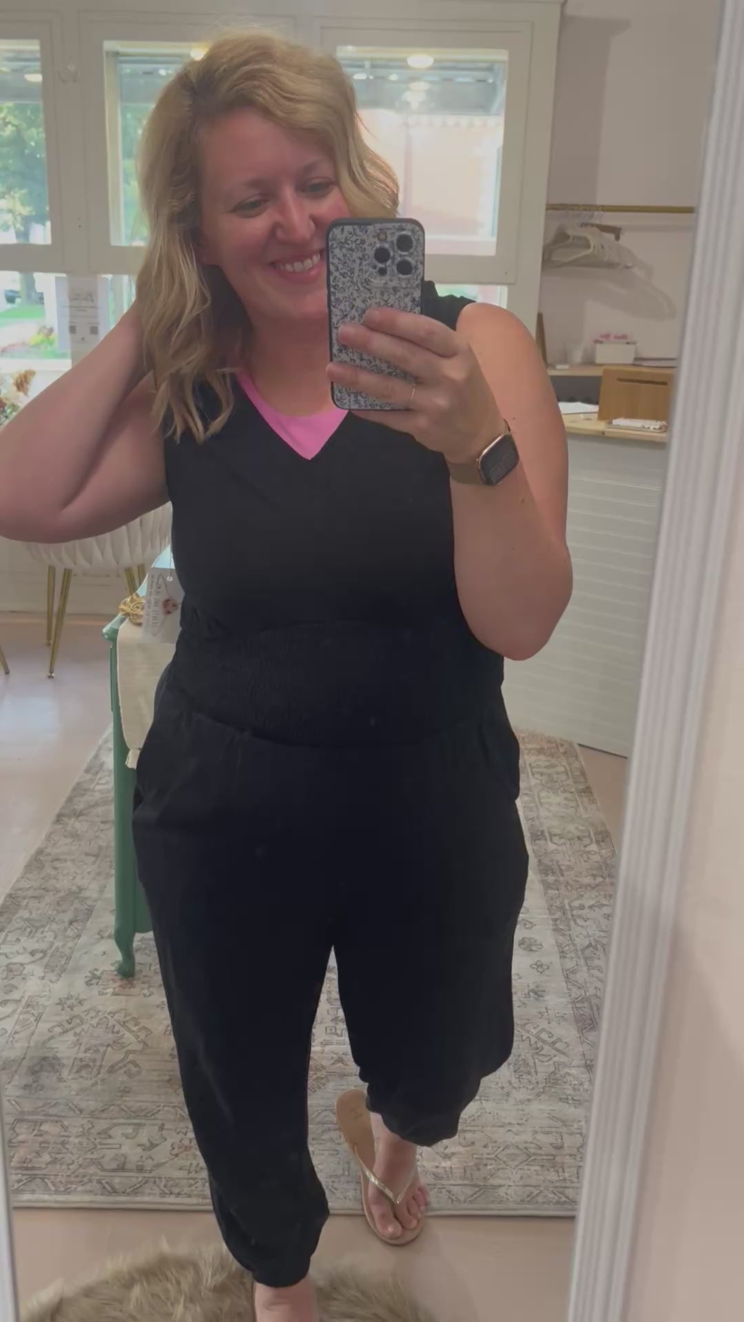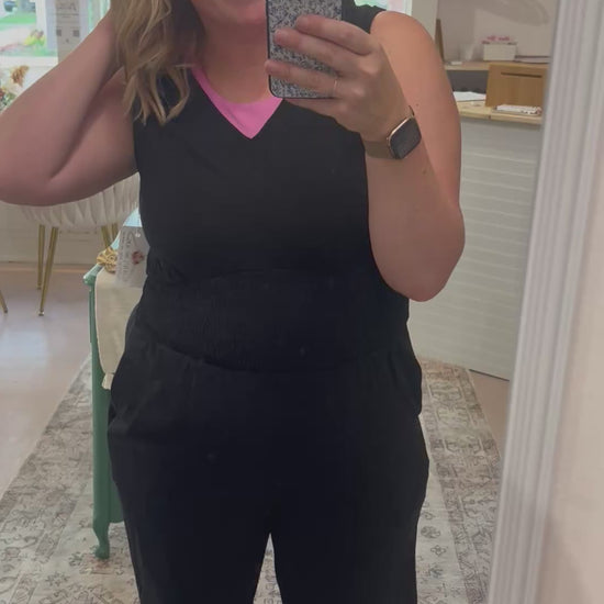 "Get ready to elevate your style with this black shirred high waist jumpsuit! The v-neck design adds a touch of sophistication, while the shirred detailing creates a flattering silhouette. Dress it up for a night out or keep it casual - this jumpsuit is versatile and stylish."