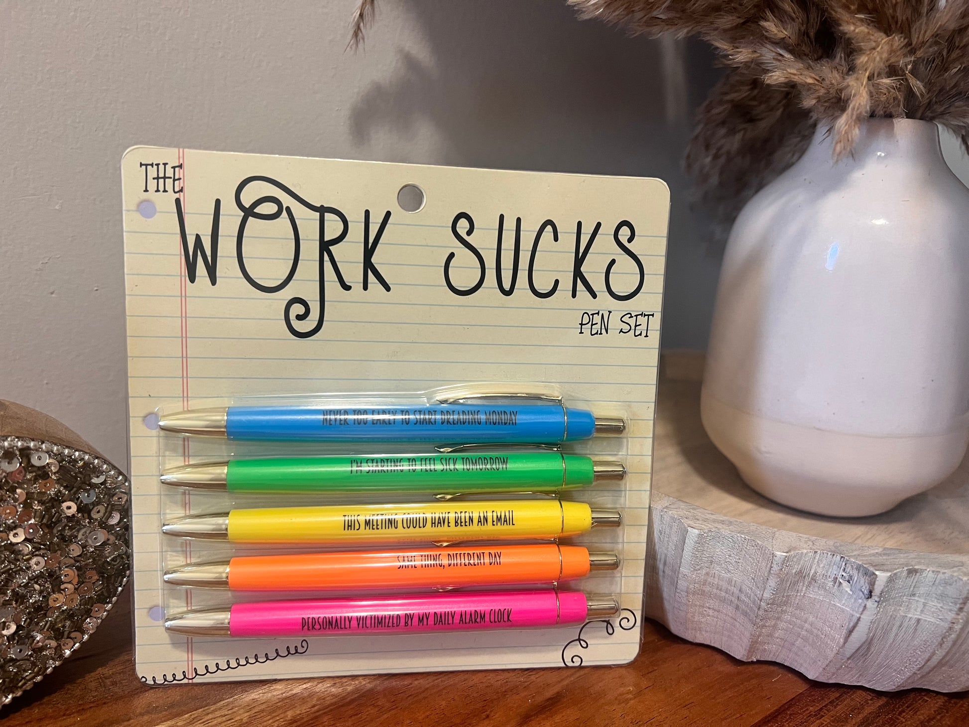 "Make every day work more fun with our Pen Sets! Perfect for Nurses and Teachers (or anyone who works hard), these sets feature funny phrases and come with black ink. Get ready to take on the day with a smile and a joke!"